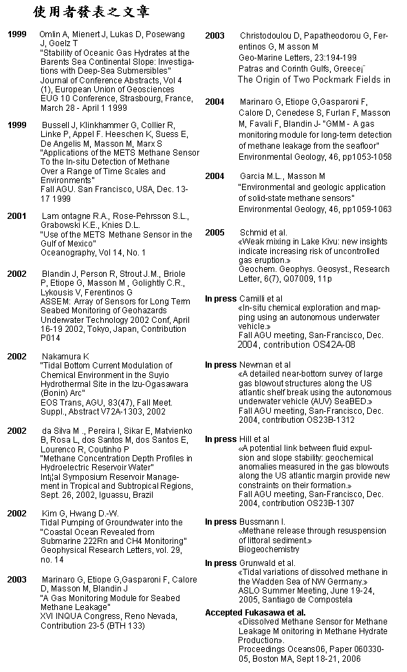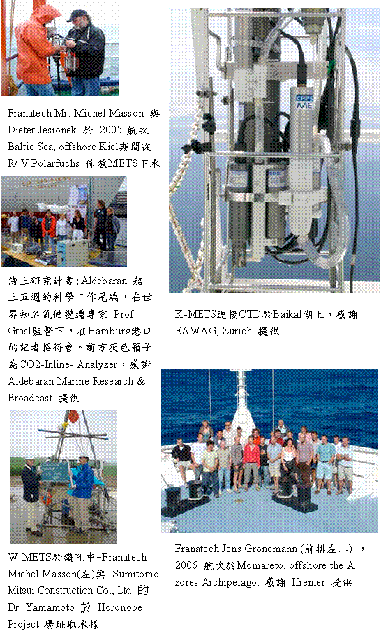 (5)CO2- Inline Analyzer為船載海面上剖面量測使用,其原型(propotype)已經被German Institute for Baltic Research 與US Monterey Bay Aquarium Research Institute實地測試成功,最近並於 Forschen auf See 研究主題架構下,在2006年夏天已佈放安裝於北海中(http://www.aldebaran.org)。